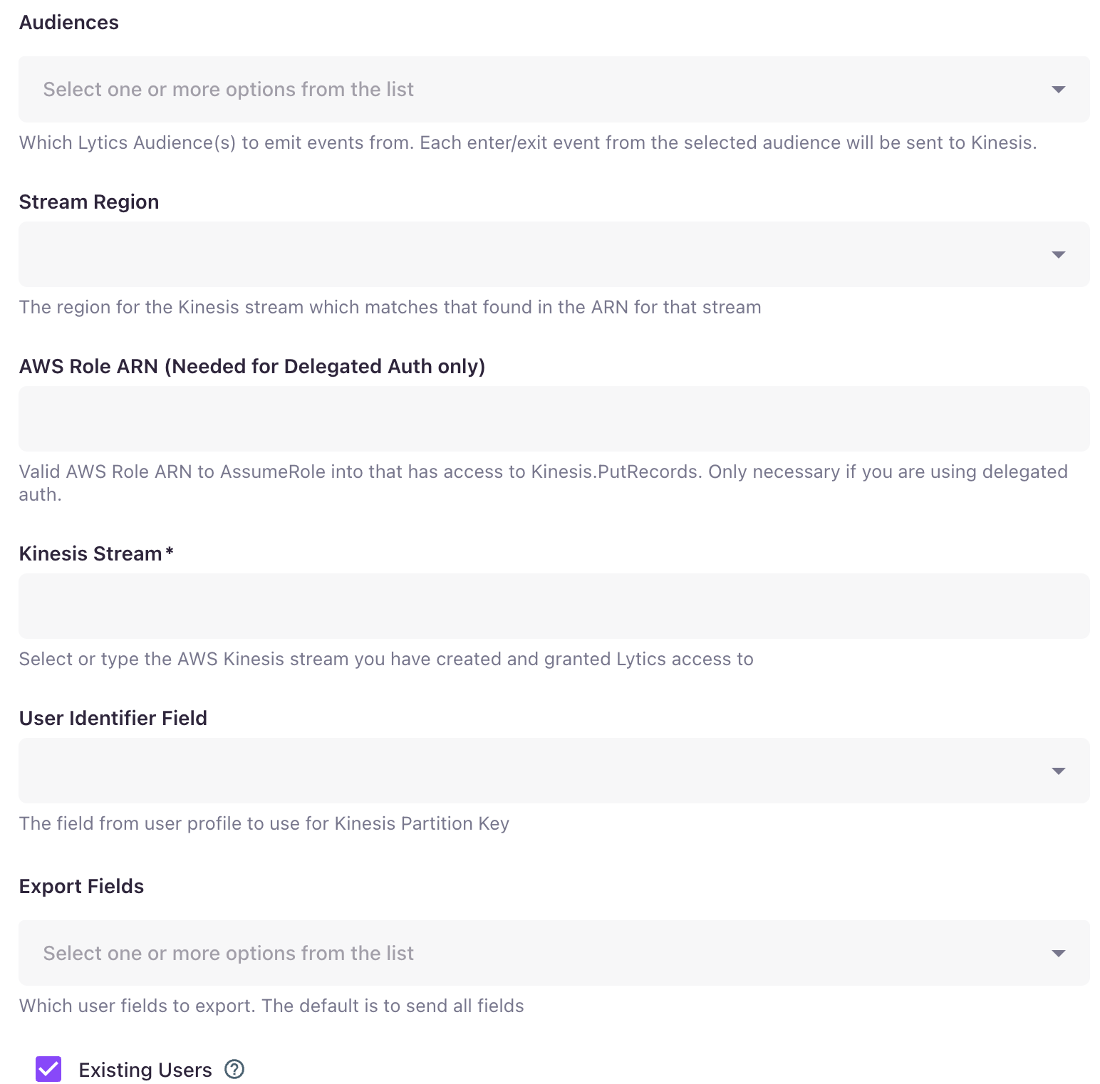 The fields included depend on the raw event in Lytics. All user fields will be included in the data published to your AWS Kinesis Data Stream unless specified in the Export Fields selection.